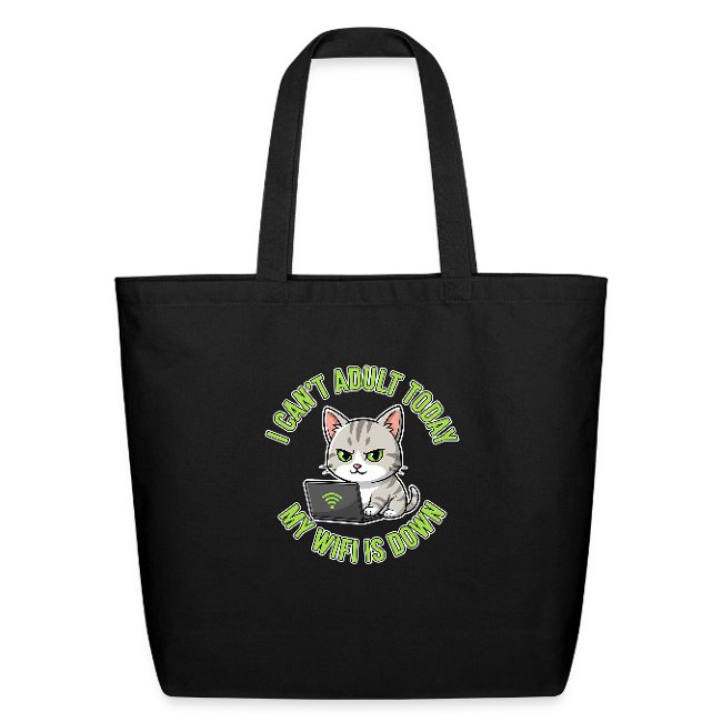 Cotton Tote Bag with Disgruntled Tabby Cat & Wi-Fi Laptop Design Natural Black One Size