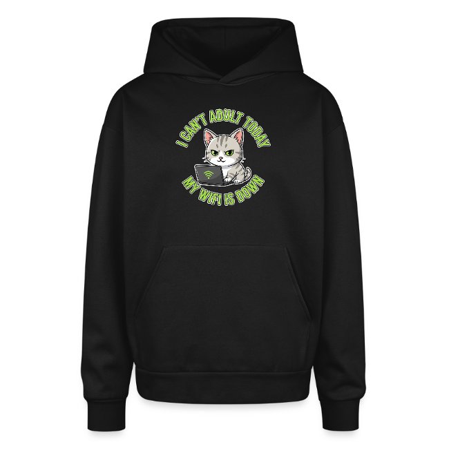 Embrace unmatched comfort and a playful spirit with this Oversized Hooded Sweatshirt, designed to blend a relaxed, easygoing style perfect for casual moments with a whimsical touch that resonates with modern life's escapism and humor. Its roomy, oversized shape and trendy drop shoulders exude a laid-back feel, while careful design elements boost both coziness and contemporary charm, complemented by a fun print featuring a disgruntled cartoon tabby cat alongside a laptop showing a Wi-Fi icon.
