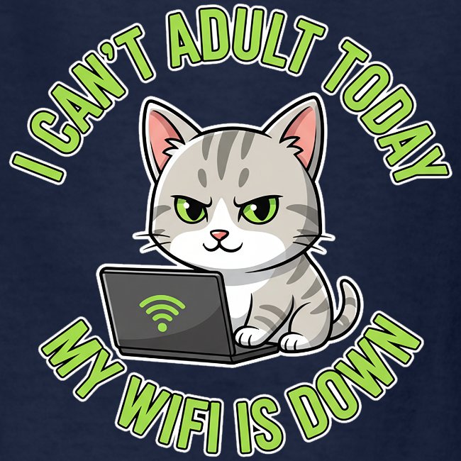 - Features a disgruntled cartoon tabby cat and a laptop with a Wi-Fi icon, blending escapism and humor in modern life