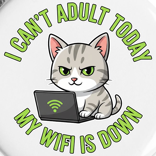 - Features a whimsical design theme centered on escapism and humor in modern life, depicting a disgruntled cartoon tabby cat alongside a laptop showing a Wi-Fi icon.