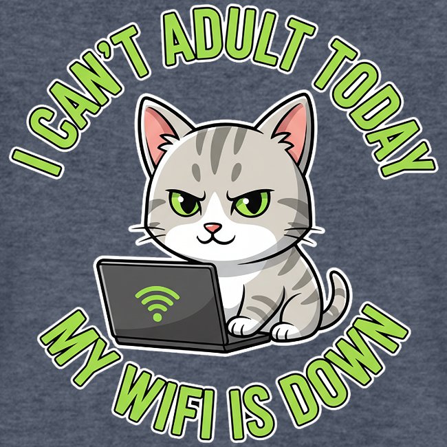 5. Features a ribbed V-neck collar and is imported, processed, and printed in the U.S.A. The design theme is Escapism and Humor in Modern Life, with a disgruntled cartoon tabby cat and a laptop showing a Wi-Fi icon as the subject, targeting young people, tech workers, students, cat lovers, those into internet culture, or anyone who has wanted to avoid responsibility due to connectivity issues.