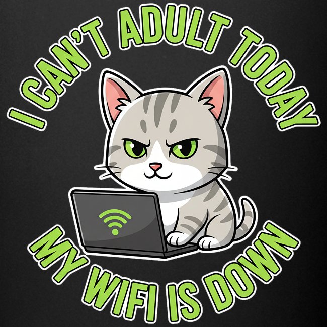 Imported; printed and processed in the U.S.A. Design Theme: Escapism and Humor in Modern Life. Design Subject: A disgruntled cartoon tabby cat and a laptop displaying a Wi-Fi icon. Target Audience: Young people, tech workers, students, cat lovers, and individuals into internet culture, or anyone who has ever wanted to shirk responsibility due to connectivity issues.