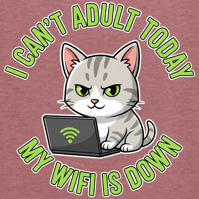 Designed around the theme of "Escapism and Humor in Modern Life," it showcases a disgruntled cartoon tabby cat alongside a laptop with a Wi-Fi icon, appealing to young people, tech workers, students, cat enthusiasts, and anyone who has joked about avoiding responsibilities due to connectivity problems.